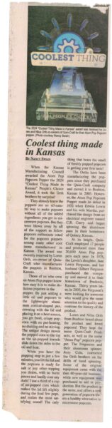 The 2024 "Coolest Thing Made in Kansas" award was received by Loren and Nilus Orth, co-owners of Quin-Craft, for their Atom Pop Popcorn popper.